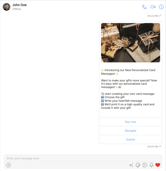 | message | CardMessage | An instance of the CardMessage class which holds information about the card such as image URL, text, and action buttons. |